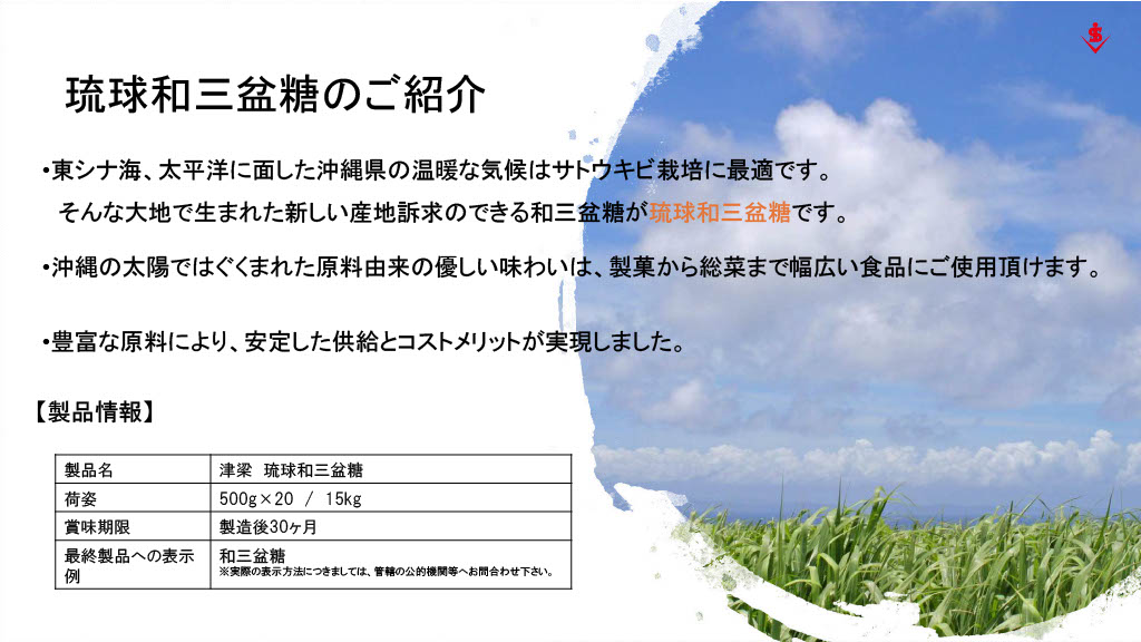 ●沖縄県産原料と製造地にこだわり製造した新しい産地訴求のできる和三盆糖が琉球和三盆糖です。●東シナ海、太平洋に面した沖縄県の温暖な気候はサトウキビ栽培に最適です。豊富な原料により、安定した供給とコストメリットが実現しました。