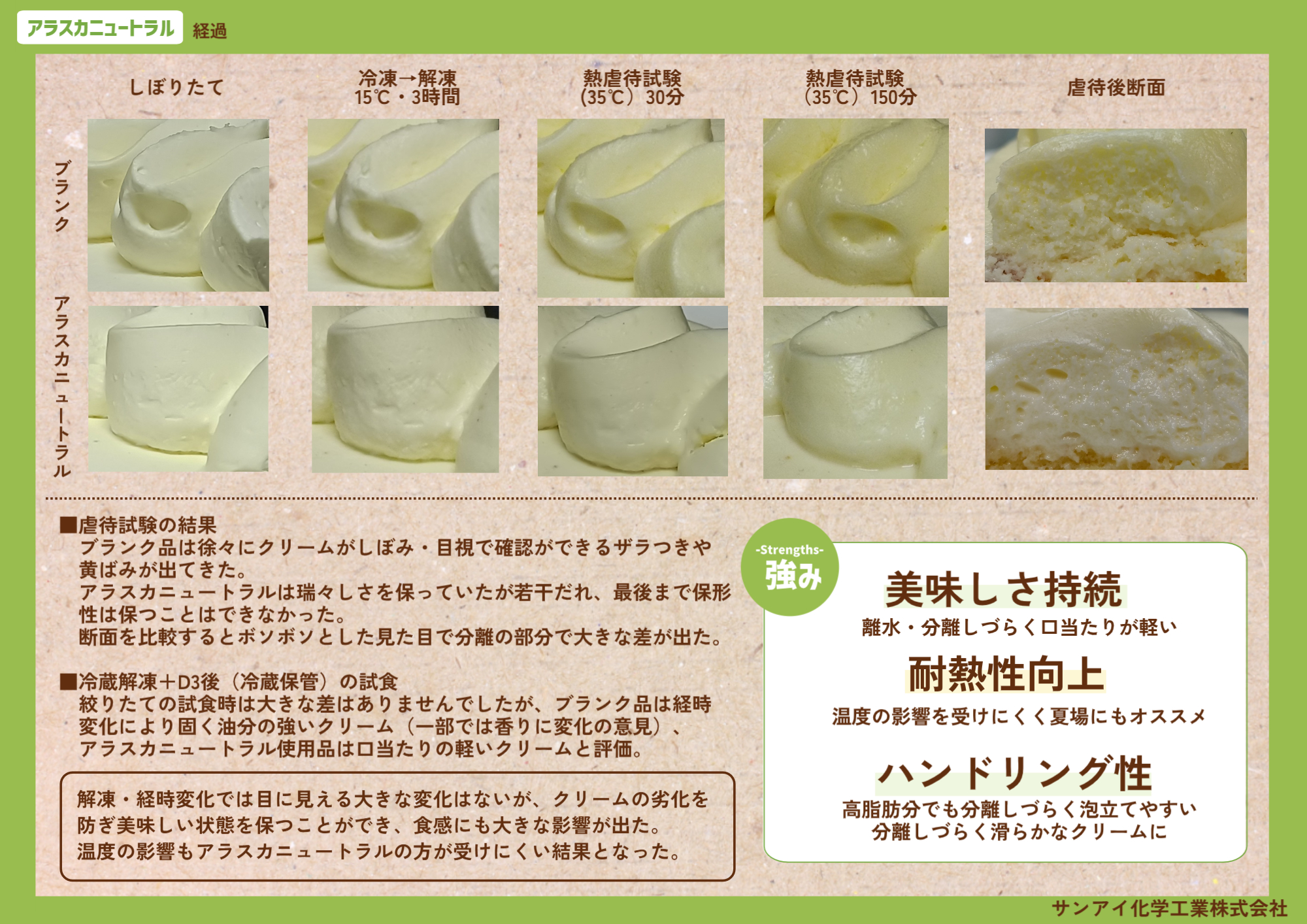 ホイップクリーム/フレッシュクリーム/生クリーム/ダレ/だれ/離水/型崩れ/耐性/冷凍/解凍/結露/持ち帰り/温度変化/保形/鉄壁クリーム/スポンジふわふわ/